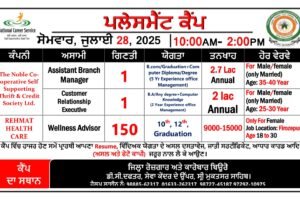 ਮੁਕਤਸਰ ਸਾਹਿਬ, 25 ਜੁਲਾਈ: ਜ਼ਿਲ੍ਹਾ ਰੋਜ਼ਗਾਰ ਅਫ਼ਸਰ ਕੰਵਲਪੁਨੀਤ ਕੌਰ ਨੇ ਜਾਣਕਾਰੀ ਦਿੰਦੇ ਹੋਏ ਦੱਸਿਆ ਕਿ ਜ਼ਿਲ੍ਹਾ ਰੋਜ਼ਗਾਰ ਅਤੇ ਕਾਰੋਬਾਰ ਬਿਊਰੋ, ਸ੍ਰੀ ਮੁਕਤਸਰ ਸਾਹਿਬ ਵਿਖੇ 28 ਜੁਲਾਈ 2025 ਦਿਨ ਸੋਮਵਾਰ ਨੂੰ ਪਲੇਸਮੈਂਟ ਕੈਂਪ ਲਗਾਇਆ... Read more »