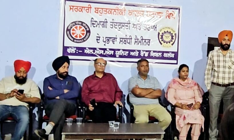 ਬਟਾਲਾ, 3 ਅਪ੍ਰੈਲ ( ) ਡਾਇਰੈਕਟਰ ਤਕਨੀਕੀ ਸਿੱਖਿਆ ਅਤੇ ਉਦਯੋਗਿਕ ਸਿਖਲਾਈ ਵਿਭਾਗ ਦੇ ਦਿਸ਼ਾ ਨਿਰਦੇਸ਼ਾਂ ਅਨੁਸਾਰ ਸਰਕਾਰੀ ਬਹੁਤਕਨੀਕੀ ਕਾਲਜ ਬਟਾਲਾ ਦੇ ਪ੍ਰਿੰਸੀਪਲ ਦਵਿੰਦਰ ਸਿੰਘ ਭੱਟੀ ਦੀ ਅਗਵਾਈ ਵਿੱਚ ਐਨ.ਐਸ.ਐਸ ਯੂਨਿਟ ਅਤੇ ਰੈਡ ਰਿਬਨ ਕਲੱਬ ਵੱਲੋਂ ‘ਦਿਮਾਗੀ ਤੰਦਰੁਸਤੀ ਅਤੇ ਮਾਨਸਿਕ ਤਣਾਅ ਦੇ ਪ੍ਰਭਾਵ ਸਬੰਧੀ’ ਇੱਕ ਵਿਸ਼ੇਸ਼ ਸੈਮੀਨਾਰ ਕਰਵਾਇਆ ਗਿਆ।