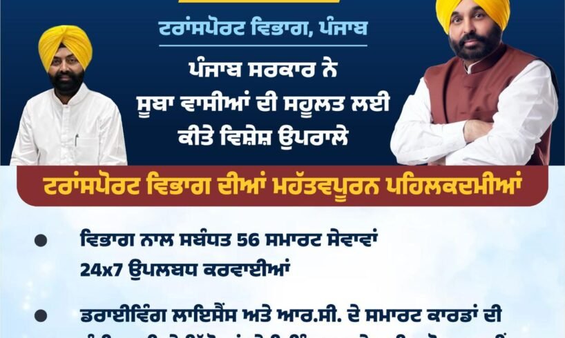 ਪੰਜਾਬ ਸਰਕਾਰ ਨੇ ਚਾਲੂ ਸਾਲ 2025 ਦੌਰਾਨ ਆਪਣੀ ਕੁਸ਼ਲ ਪ੍ਰਸ਼ਾਸਨ ਦੇਣ ਦੀ ਵਚਨਬੱਧਤਾ ਤਹਿਤ ਸੂਬੇ ਦੇ ਨਾਗਰਿਕਾਂ ਨੂੰ ਡਰਾਈਵਿੰਗ ਲਾਇਸੈਂਸ ਅਤੇ ਵਾਹਨ ਰਜਿਸਟ੍ਰੇਸ਼ਨ ਨਾਲ ਸਬੰਧਤ 56 ਸਮਾਰਟ ਸੇਵਾਵਾਂ 24 ਘੰਟੇ ਉਪਲੱਬਧ ਕਰਵਾਈਆਂ ਹਨ, ਜਿਨ੍ਹਾਂ ਦਾ ਲਾਭ ਪ੍ਰਾਰਥੀਆਂ ਵੱਲੋਂ ਆਨਲਾਈਨ ਅਪਲਾਈ ਕਰਕੇ ਜਾਂ ਸੇਵਾ ਕੇਂਦਰ ਰਾਹੀਂ (ਦਫਤਰੀ ਸਮੇਂ ਦੌਰਾਨ) ਜਾਂ ਫਿਰ 1076 ਹੈਲਪਲਾਈਨ ਨੰਬਰ ‘ਤੇ ਕਾਲ ਕਰਕੇ ਆਪਣੇ ਘਰ ਵਿਖੇ ਹੀ ਲਿਆ ਜਾ ਸਕਦਾ ਹੈ।