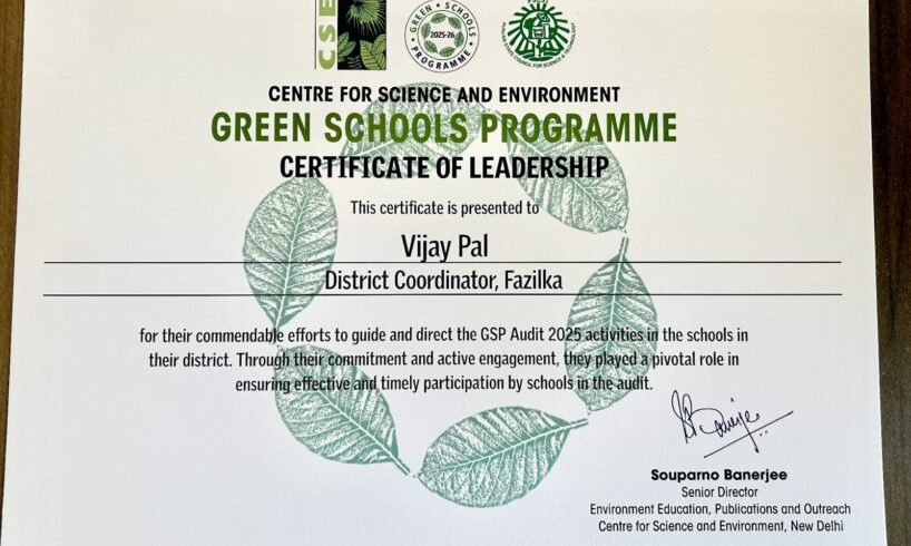 ਆਏਜੁਕੇਸ਼ਨ ਵਾਤਾਵਰਨ ਪ੍ਰੋਗਰਾਮ ਦੇ ਜ਼ਿਲ੍ਹਾ ਕੁਆਰਡੀਨੇਟਰ ਸ੍ਰੀ ਵਿਜੈ ਪਾਲ ਨੂੰ ਉਨ੍ਹਾਂ ਦੇ ਇਸ ਪ੍ਰੋਗਰਾਮ ਵਿਚ ਯੋਗਦਾਨ, ਇਸ ਨੂੰ ਜ਼ਿਲ੍ਹੇ ਵਿਚ ਪ੍ਰਭਾਵੀ ਤਰੀਕੇ ਨਾਲ ਲਾਗੂ ਕਰਵਾਉਣ ਅਤੇ ਇਸ ਲਈ ਜ਼ਿਲ੍ਹੇ ਤੋਂ ਜਿਆਦਾ ਤੋਂ ਜਿਆਦਾ ਅਤੇ ਸਮੇਂ ਸਿਰ ਭਾਗੀਦਾਰੀ ਯਕੀਨੀ ਬਣਾਉਣ ਲਈ ਸੈਂਟਰ ਫਾਰ ਸਾਇੰਸ ਐਂਡ ਇਨਵਾਇਰਮੈਂਟ ਵੱਲੋਂ ਇਹ ਸਨਮਾਨ ਪੱਤਰ ਦਿੱਤਾ ਗਿਆ ਹੈ। ਇਹ ਸਮਾਗਮ ਇੰਡੀਆ ਹੈਬੀਟੈਟ ਸੈਂਟਰ ਨਵੀ ਦਿੱਲੀ ਦੇ ਆਡੀਟੋਰੀਅਮ ਹਾਲ ਵਿਖੇ ਕਰਵਾਇਆ ਗਿਆ। ਉਨ੍ਹਾਂ ਕਿਹਾ ਕਿ ਗ੍ਰੀਨ ਸਕੂਲ ਪ੍ਰੋਗਰਾਮ ਦੀ ਰੇਟਿੰਗ ਵਾਤਾਵਰਣ ਦੇ ਵੱਖ—ਵੱਖ ਪਹਿਲੂਆਂ ਹਵਾ, ਉਰਜਾ, ਜਮੀਨ, ਭੋਜਨ, ਪਾਣੀ, ਰਹਿੰਦ—ਖੂਹੰਦ ਦੀ ਸਹੀ ਵਰਤੋਂ ਅਤੇ ਸਾਂਭ—ਸੰਭਾਲ ਦੇ ਆਧਾਰ *ਤੇ ਕਰਵਾਈ ਜਾਂਦੀ ਹੈ।ਉਨ੍ਹਾਂ ਕਿਹਾ ਕਿ ਇਨ੍ਹਾਂ ਪਹਿਲੂਆਂ ਦੇ ਆਧਾਰ *ਤੇ ਹੀ ਜ਼ਿਲ੍ਹਾ ਫਾਜ਼ਿਲਕਾ ਦੇ 11 ਸਕੂਲਾਂ ਨੇ ਇਹ ਮਾਣ ਹਾਸਲ ਕੀਤਾ ਹੈ।