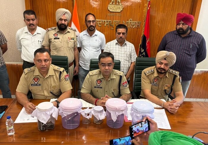 ਪ੍ਰੈੱਸ ਕਾਨਫ਼ਰੰਸ ਦੌਰਾਨ ਐੱਸ.ਪੀ. ਹੈੱਡ ਕੁਆਟਰ ਸ੍ਰੀ ਜੁਗਰਾਜ ਸਿੰਘ, ਡੀ.ਐੱਸ.ਪੀ. (ਡੀ.) ਸ੍ਰੀ ਗੁਰਵਿੰਦਰ ਸਿੰਘ, ਡੀ.ਐੱਸ.ਪੀ. (ਸਿਟੀ) ਮਨਮੋਹਨ ਸਿੰਘ, ਸ੍ਰੀ ਅਜੇ ਕੁਮਾਰ, ਐੱਸ.ਐੱਚ.ਓ. ਘੁੰਮਣ ਕਲਾਂ ਸਬ ਇੰਸਪੈਕਟਰ ਸ੍ਰੀ ਜਗਦੀਸ਼ ਸਿੰਘ, ਸਪੈਸ਼ਲ ਬਰਾਂਚ ਇੰਸਪੈਕਟਰ ਸ੍ਰੀ ਰਾਕੇਸ਼ ਕੁਮਾਰ, ਸ੍ਰੀ ਨਰੇਸ਼ ਕੁਮਾਰ ਵੀ ਹਾਜ਼ਰ ਸਨ।