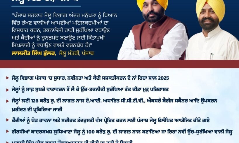 ਪੰਜਾਬ ਦੇ ਜੇਲ੍ਹ ਮੰਤਰੀ ਲਾਲਜੀਤ ਸਿੰਘ ਭੁੱਲਰ ਨੇ ਕਿਹਾ ਕਿ ਪੰਜਾਬ ਸਰਕਾਰ ਜੇਲ੍ਹ ਵਿਭਾਗ ਅੰਦਰ ਆਪਣੀਆਂ ਮਾਨਵਪੱਖੀ ਪਹਿਲਕਦਮੀਆਂ ਦਾ ਵਿਸਥਾਰ ਕਰਨ, ਤਕਨਾਲੋਜੀ ਰਾਹੀਂ ਸੁਰੱਖਿਆ ਵਧਾਉਣ, ਅਤੇ ਕੈਦੀਆਂ ਨੂੰ ਹੁਨਰਾਮੰਦ ਬਣਾਉਣ ਲਈ ਕਿੱਤਾਮੁਖੀ ਸਿਖਲਾਈ ਨੂੰ ਵਧਾਉਣ ਲਈ ਵਚਨਬੱਧ ਹੈ। ਉਨ੍ਹਾਂ ਕਿਹਾ ਕਿ ਚਾਲੂ ਵਰ੍ਹੇ ਦੌਰਾਨ ਪੰਜਾਬ ਦੀਆਂ ਜੇਲ੍ਹਾਂ ਨੂੰ ਸਾਫ ਸੁਥਰੇ ਵਾਤਾਵਰਨ ਤੋਂ ਲੈ ਕੇ ਉੱਚ-ਤਕਨੀਕੀ ਸੁਰੱਖਿਆ ਤੱਕ ਮੁੜ ਪਰਿਭਾਸ਼ਿਤ ਕੀਤਾ ਗਿਆ ਹੈ। ਉਨ੍ਹਾਂ ਕਿਹਾ ਕਿ “ਸਾਡਾ ਧਿਆਨ ਕੈਦੀਆਂ ਦੀ ਸੁਰੱਖਿਆ ਨੂੰ ਯਕੀਨੀ ਬਣਾਉਂਦੇ ਹੋਏ ਉਨ੍ਹਾਂ ਦੇ ਜੀਵਨ ਨੂੰ ਦੁਬਾਰਾ ਬਣਾਉਣ ਦਾ ਮੌਕਾ ਦੇਣ ‘ਤੇ ਰਿਹਾ ਹੈ।”