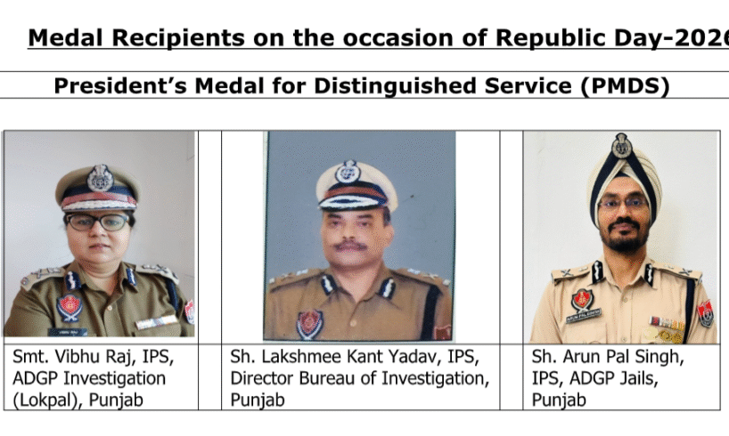 ਪੰਜਾਬ ਪੁਲਿਸ ਦੀਆਂ ਸ਼ਾਨਦਾਰ ਸੇਵਾਵਾਂ ਨੂੰ ਮਾਨਤਾ ਦਿੰਦਿਆਂ ਭਾਰਤ ਸਰਕਾਰ ਦੇ ਗ੍ਰਹਿ ਮੰਤਰਾਲੇ ਨੇ 77ਵੇਂ ਗਣਤੰਤਰ ਦਿਵਸ ਦੀ ਪੂਰਵ ਸੰਧਿਆ ‘ਤੇ, ਪੰਜਾਬ ਪੁਲਿਸ ਦੇ ਉਨ੍ਹਾਂ ਅਧਿਕਾਰੀਆਂ/ਕਰਮਚਾਰੀਆਂ ਦੇ ਨਾਵਾਂ ਦਾ ਐਲਾਨ ਕੀਤਾ, ਜਿਨ੍ਹਾਂ ਨੂੰ ਵਿਲੱਖਣ ਸੇਵਾ ਲਈ ਰਾਸ਼ਟਰਪਤੀ ਮੈਡਲ (ਪੀਐਮਡੀਐਸ) ਅਤੇ ਬੇਮਿਸਾਲ ਸੇਵਾ ਲਈ ਮੈਡਲ (ਐਮਐਮਐਸ) ਨਾਲ ਸਨਮਾਨਿਤ ਕੀਤਾ ਜਾਵੇਗਾ।